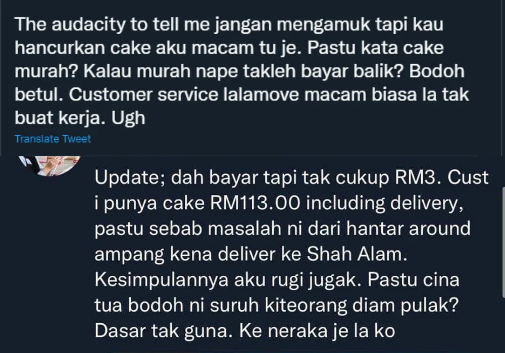 What happened was – said baker had a cake order that needed to be delivered to Ampang, and according to her, it is relatively nearby. After receiving photos that her cake was destroyed, she immediately contacted the Lalamove driver demanding a refund but was told to “Shut up” instead. Astounded, the younger baker started a rant on Twitter about what happened.