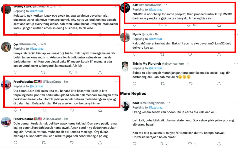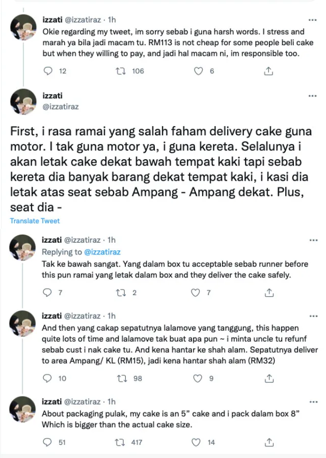 Izzati complained that the Lalamove driver would not take responsibility of his actions. She demanded that the rider pay her RM113 (including delivery) for the cake. Afterwards, she updated on Twitter that she was reimbursed, but netizens were outraged.