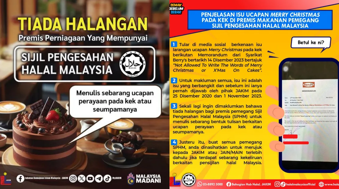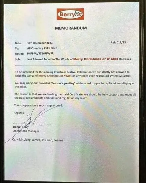 On Thursday (14th December), Berry’s Cake House posted a notice at one of their outlets to inform that the words “Merry Christmas” or “Xmas” were not allowed to be written on their cakes, even if requested by customers. “You may use our provided ‘Seasons Greetings’ card toppers instead to display on the cakes. The reason is that we possess a Halal Certificate and should adhere to the rules and regulations of the certificate set by JAKIM,” the company wrote.