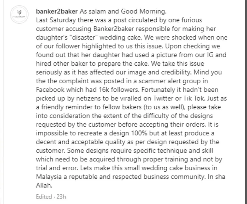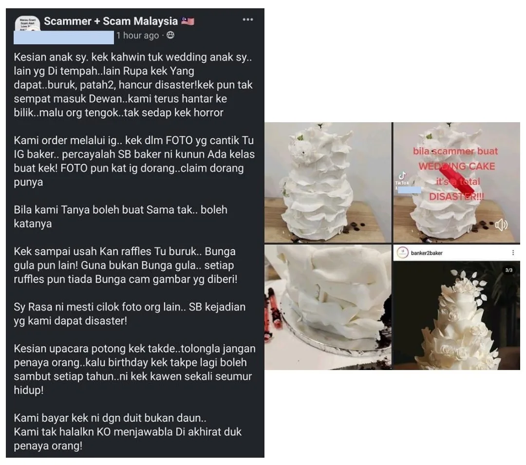 Recently, an angry customer posted on the Scammer + Scam Malaysia Facebook group to express her dissatisfaction with how her daughter’s wedding cake turned out. “We immediately hide the cake in the room cause we were too embarrassed for the guests to see. It was just horrible,” the customer wrote. The netizen then accused Banker2Baker bakery of scamming them as the cake didn’t look anything like in the photos.