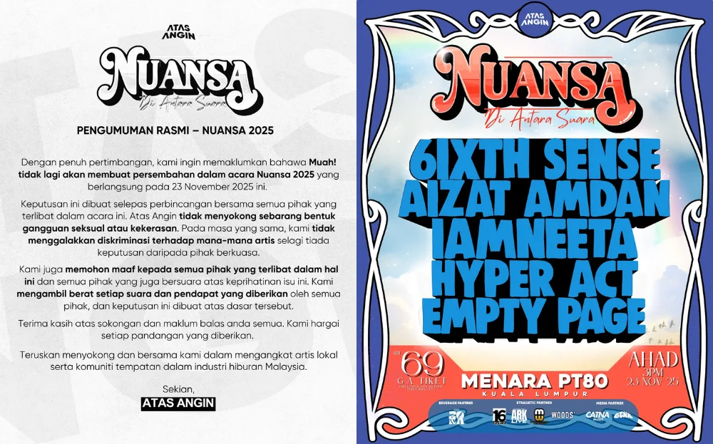 Previously, local concert organiser Atas Angin announced their Nuansa 2025 show, which featured a lineup including Aizat Amdam, iamNEETA and Muah!. The concert will take place this Sunday (23rd November 2025) at Menara PT80. However, it was Muah!’s inclusion in the show that sparked debate because of their main vocalist, Naim Daniel. Earlier this year, the singer faced allegations of sexually assaulting a minor.