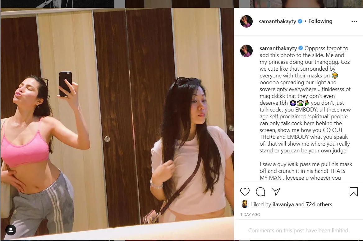 Samantha has definitely been making headlines quite recently with her anti-vax sentiments and her accounts filled of conspiracy theories. Since creating a second account on IG, she occasionally uses her second account to post her thoughts on these conspiracy theories.