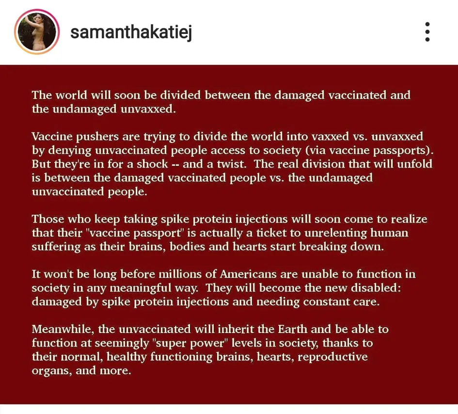 Her recent post, stated, “The world will soon be divided between the damaged vaccinated and the undamaged unvaccinated. Vaccine pushers are trying to divide the world into vaxxed vs unvaxxed by denying unvaccinated people access to society (via vaccine passports). But they’re in for a shock — and a twist. The real division that will unfold is between the damaged vaccinated vs the undamaged unvaccinated people. Those who keep taking spike protein injections will soon come to realise that their ‘vaccine passport’ is actually a ticket to unrelenting human suffering as their brains, bodies and hearts start breaking down. It won’t be long before millions of Americans are unable to function in society in any meaningful way. They will become the new disabled: damaged by spike protein injections and needing constant care. Meanwhile, the unvaccinated will inherit the Earth and be able to function at seemingly ‘super power’ levels in society, thanks to their normal, healthy functioning brains, hearts, reproductive organs and more.”