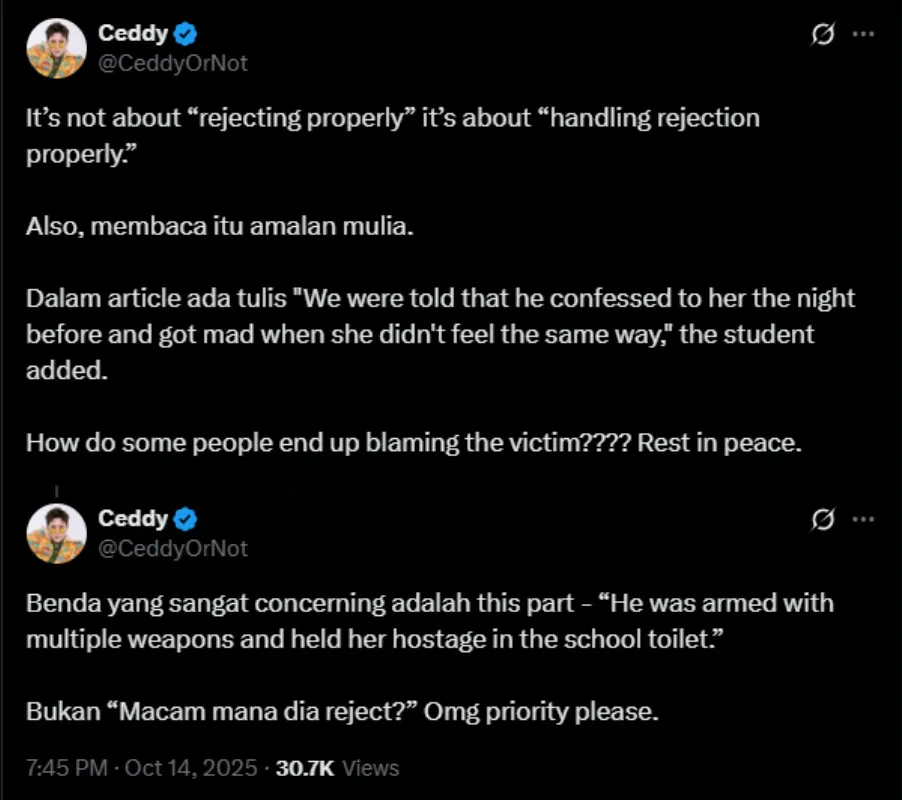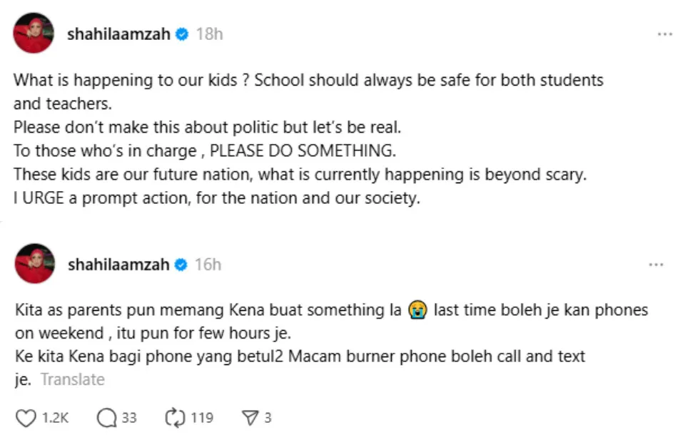 Singer Shila Amzah took to Threads to urge the government and authorities to take immediate and effective action to prevent such tragedies from happening again, stressing that schools should always remain safe spaces for both students and teachers. “What is happening to our kids? Schools should always be safe for both students and teachers. Please don’t make this about politics — let’s be real. To those in charge, PLEASE DO SOMETHING. These kids are our future; what is happening now is beyond frightening. I URGE prompt action, for the sake of our nation and society,” she wrote.