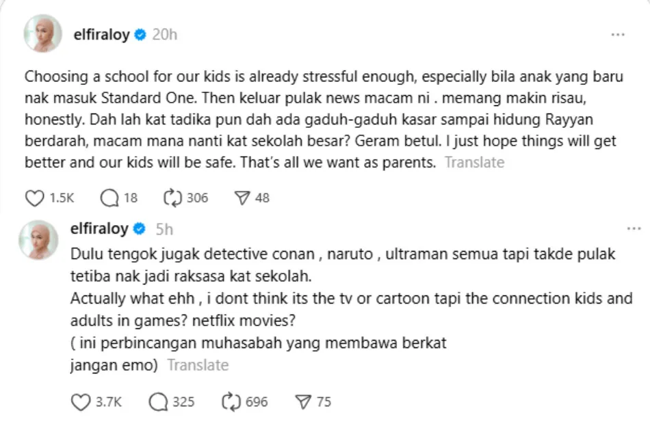 Actress Elfira Loy took to Threads to express her concern about her children’s future. She noted that parents are already under immense pressure when it comes to choosing the right school for their children, but with the recent incidents, they now also have to worry about their safety. “If kids can get hurt from fighting in kindergarten, imagine what it would be like once they’re older. It’s so frustrating. I just hope things will get better and our kids will be safe. That’s all we want as parents,” she said.