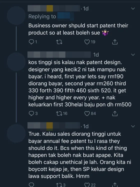 In response, one particular commentator suggested for local designers to copyright their designs in order to prevent from being ripped off. However, another user replied by stating that the process of patenting their designs may costs a lot.