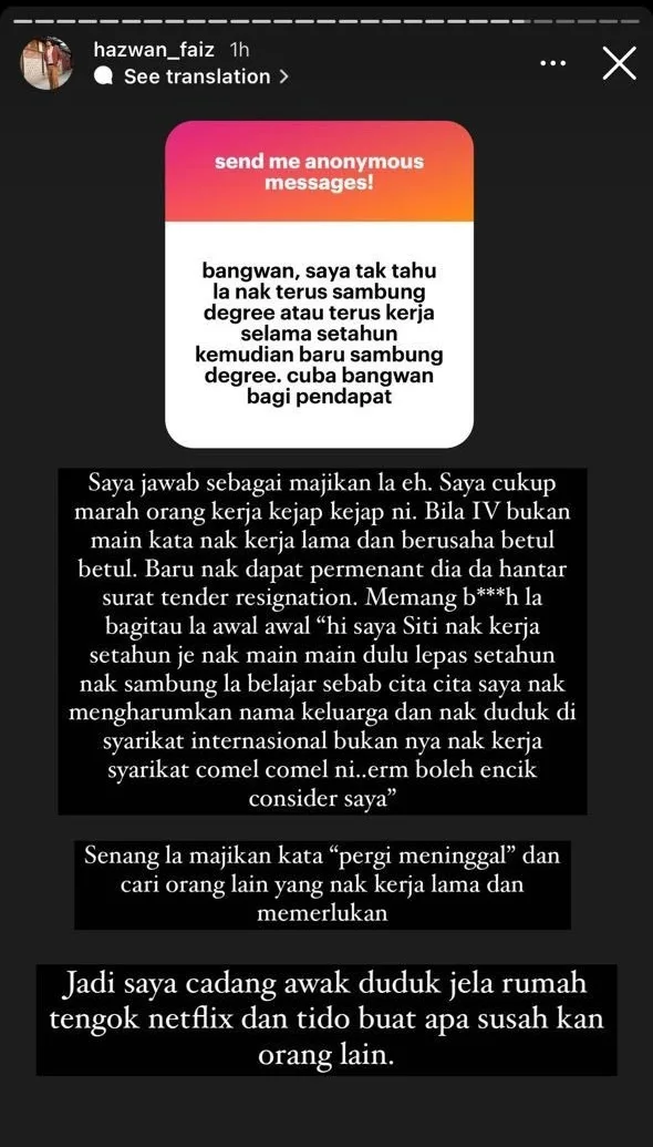 The founder of the fashion brand Cala Qisya, Hazwan Faiz recently answered a netizen’s question through an IG story. In the screenshot above, a netizen had asked for the entrepreneur’s advice on whether they should immediately pursue their degree or work for a year before continuing their studies. The response, however, may not be what they had expected.