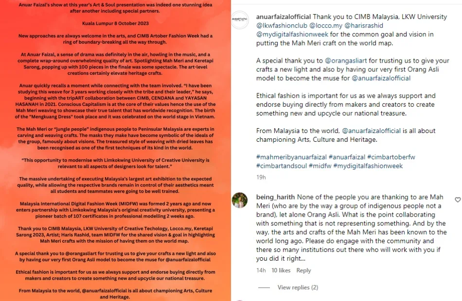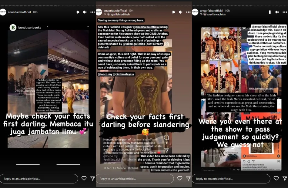 Anuar Faizal quickly responded to the allegations, denying the accusation of cultural appropriation. The fashion designer shared several IG stories to address some of the accusations. In a few posts, the garment maker asked the accusers to do a fact-check on his latest collection and what it represents before slandering him. He also clarified that indigenous models were hired to showcase the new collection.