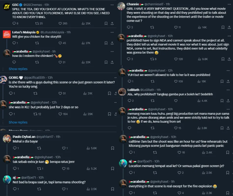 “I no longer have to keep this a secret 😭😭😭,” she wrote in her IG story. Local Marvel fans congratulated the internet personality for landing her role as an extra for such a huge project. As expected, many curious netizens seized the opportunity to ask her about filming the scene. Even Golden Screen Cinemas (GSC) and Lotus’s Malaysia were eager to learn all the behind-the-scenes details. Sadly, Syaza could only share so much, as she and everyone involved had to sign a NDA (Non-Disclosure Agreement).