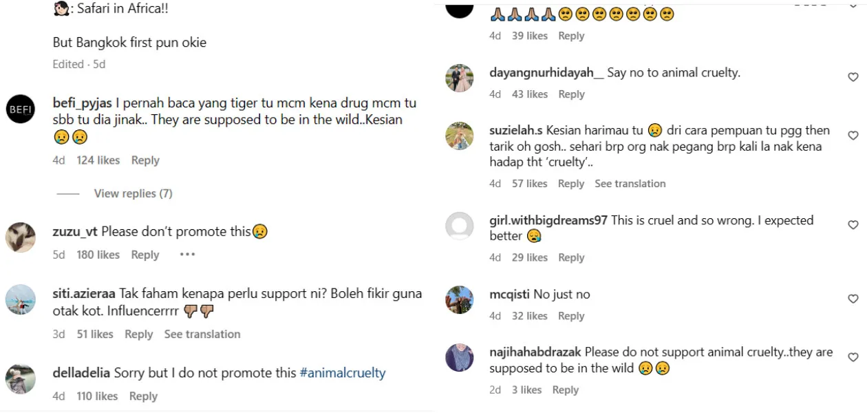 One netizen commented, “I read somewhere that the tigers were drugged, that’s why they can be tamed. They’re supposed to be in the wild. Pity the tiger.” Another commenter criticised the social media figure, saying, “I don’t get why you have to support this. You can use your brain. Influencer 👎👎.”