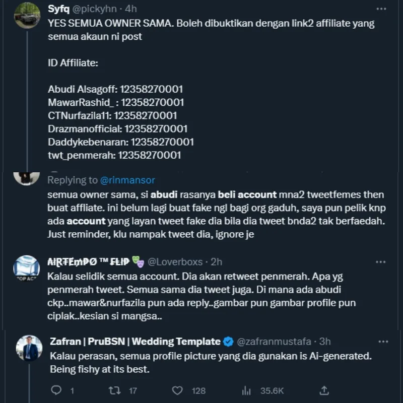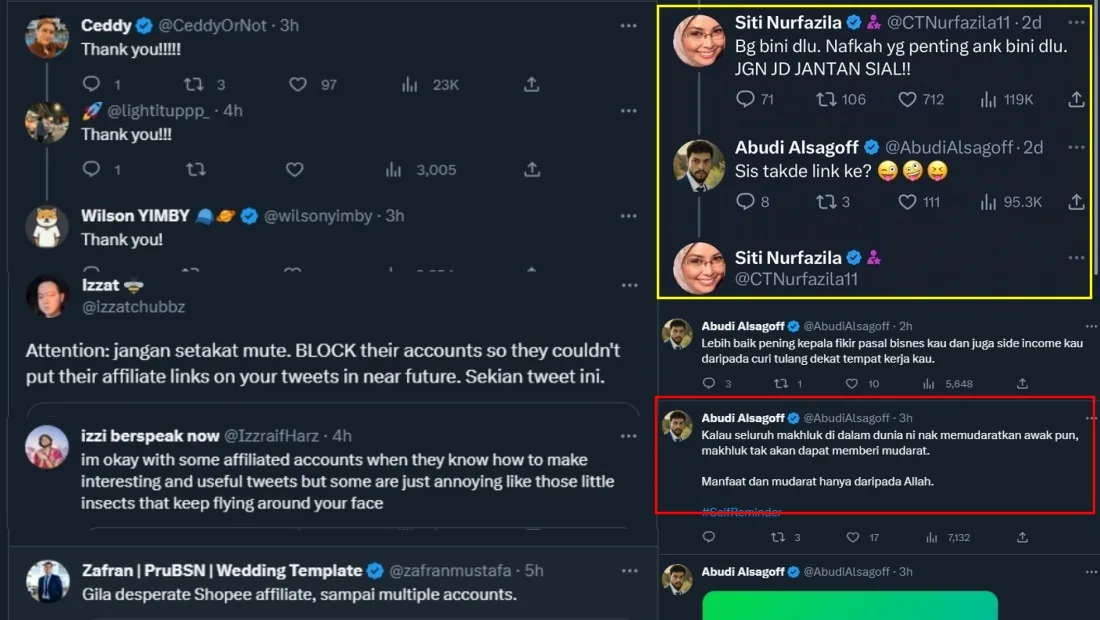 Many, including influencer Ceddy Ang, thanked the two users for exposing the content creator for his shady activities. Some responded to the posts by urging everyone to block those accounts to avoid the tweet-famous user from putting affiliate links on other people’s tweets in the near future. Others also provided screenshots of how Abudi would interact with his other accounts.