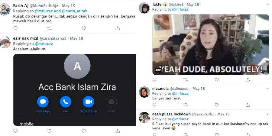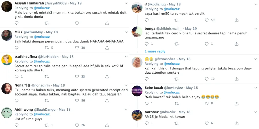 In response, a lot of netizens took to the replies section to bash both the Malaysian chick as well as the list of men who were generous enough to channel their money just to get to know her. Additionally, some even tried their luck by leaving their bank details, hoping that someone will donate some cash to them.
