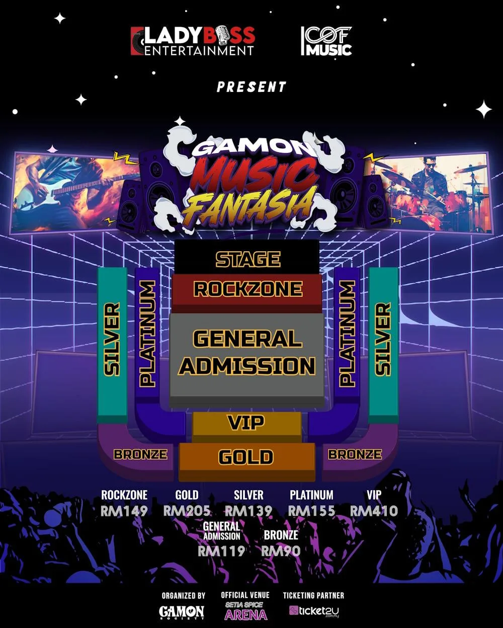 - Ticket Prices: Bronze (seated): RM90, General Admission (free standing): RM119, Silver (seated): RM139, Rockzone (free standing): RM149, Platinum (seated): RM155, Gold (seated): RM205, VIP (seated): RM410