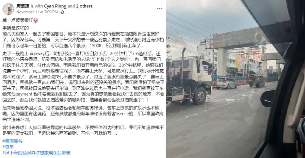 According to a netizen who shared her story on Facebook on 11th November, her recent trip to Bangkok, Thailand had almost ended badly when they chose to take an unofficial chartered car for a trip. Luckily, they were aware enough to realise when something was suspicious about the trip and were able to escape safely.