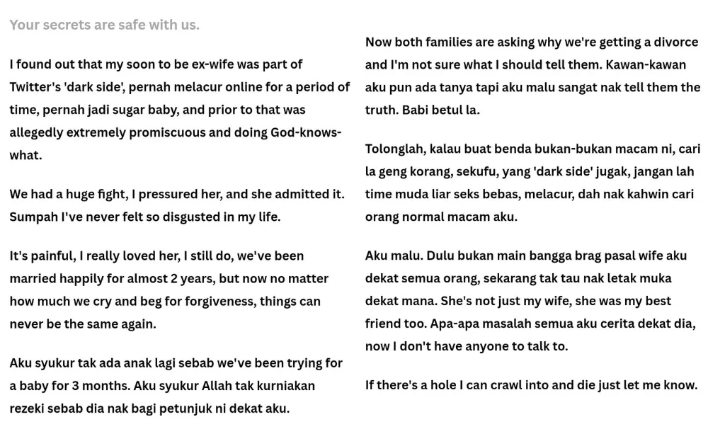 In an anonymous sharing through the TwtSecretsMY Twitter account, the unnamed man said he found out that his wife had an “extremely promiscuous” past after the two fought. He said that his wife was once involved in online sex work and was a sugar baby for an undisclosed period. The man said his wife admitted to her past after he pressured her during their fight.