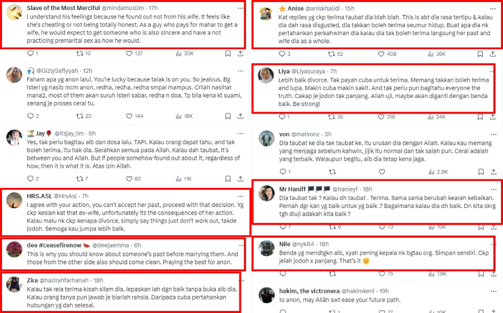 Many sympathised with him, agreeing that accepting your spouse’s past can be difficult if it goes against your personal beliefs. Many also said he made a wise decision to file for divorce because more problems may arise in their relationship in the future. However, some netizens said he should’ve given her another chance, believing the wife may have repented and regretted her past. Some also used the situation to advise others to be honest with their partners, especially before marriage.