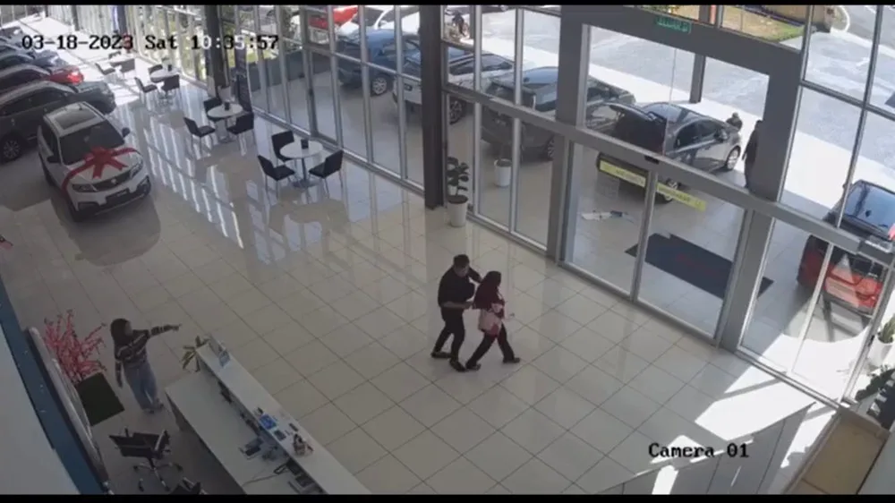 The perpetrator then tried to leave the showroom, while still holding the woman. However, he was stopped in his tracks by another man who approached him from outside the store. The man attempted to approach the situation calmly, but the perpetrator yanked the woman away and lashed out at the man when he got too close.