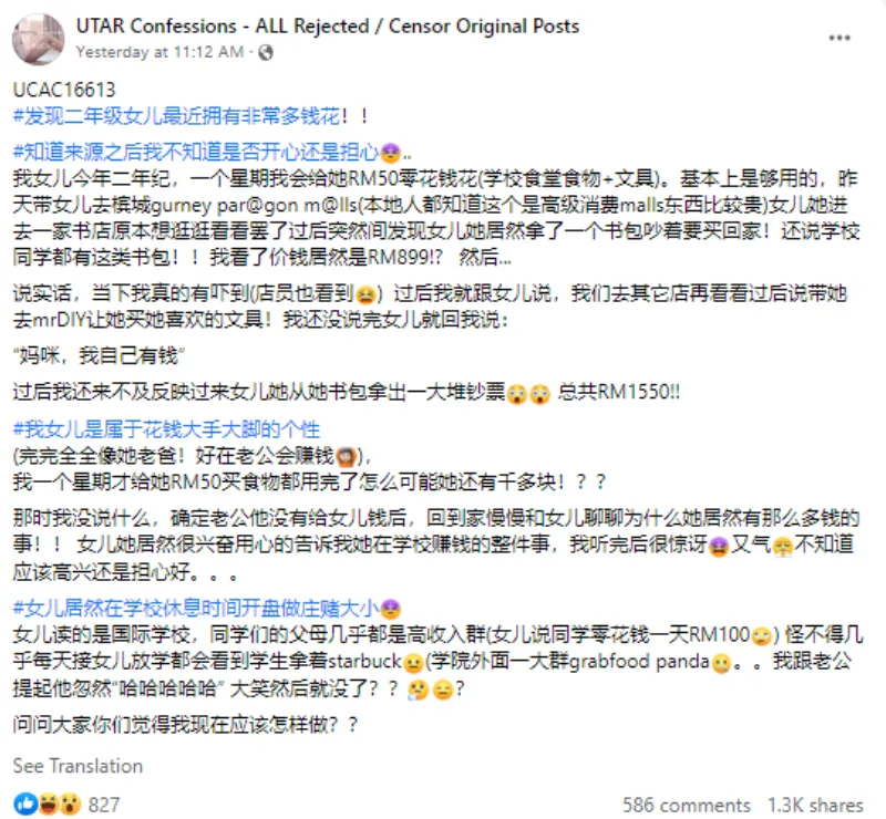The mother shared her story through the ‘UTAR Confessions – ALL Rejected / Censor Original Post’ Facebook page. In the post, she said that her daughter is in Standard 2 this year and gets RM50 per week for lunch money and other school expenses. While shopping at Gurney Paragon Mall in Penang, the schoolgirl wanted to purchase a bag worth RM899, saying all her friends had the same bag.