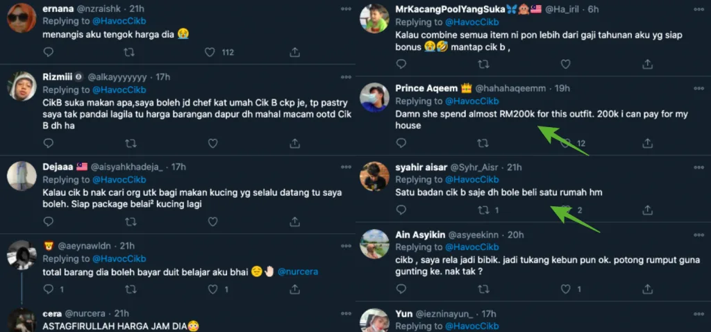 Many Twitter users were left astounded after seeing her tweet! In this case, most of them pointed out that the total cost of Cik B’s clothing and accessories is equal to the price of a house, and way more than their acquired salaries. Apart from that, some even compared the price of her wrist watch to the newly-released Proton X50 car.