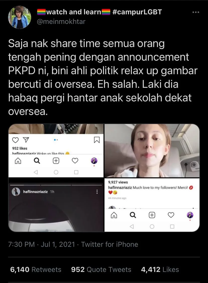 Despite the concerns surrounding the impending EMCO situation, however, a netizen known as @meinmokhtar, took to his Twitter to call out the wife of a local politician, who was flying abroad with her son. It’s believed that the public figure has travelled to France to enrol her son for school. She also uploaded several posts on her IG, capturing their happy moments while on board.