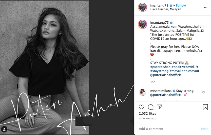 The unfortunate news was confirmed by her manager, Iman Tang on his Instagram yesterday (Tuesday, 7th April). “Puteri Aishah just tested positive for Covid-19 an hour ago. Please pray for her. Please pray so that she can recover quickly. Stay strong Puteri,” Iman wrote on the caption.
