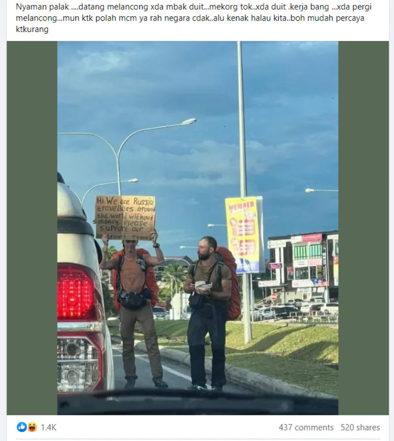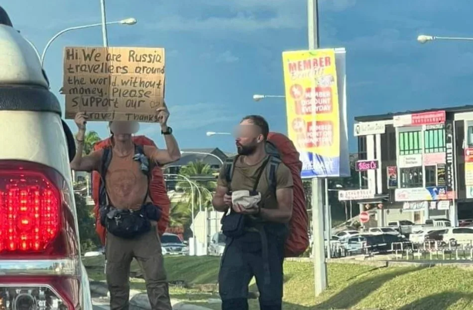 A couple of days ago, the Bintulu Info Facebook page posted a photo of two Russian “begpackers” on the side of a road in Bintulu, Sarawak with one of them holding up a cardboard sign that says, “We are Russian travellers travelling around the world without money. Please support our travels. Thanks”.
