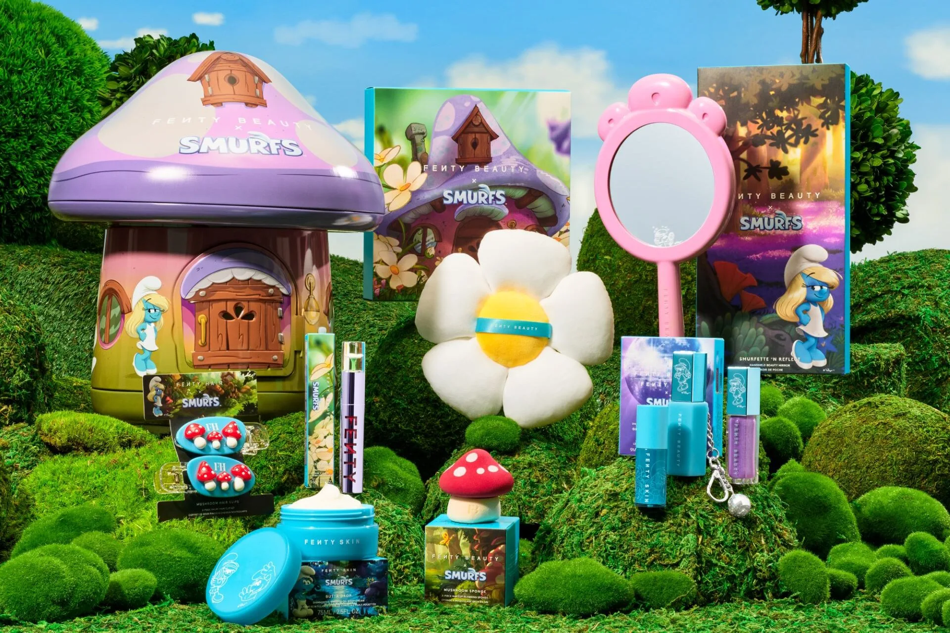 With vibrant hues, collector-worthy packaging, and fun add-ons like mushroom hair clips and disco ball keychain, the collection captures the sweet and bold spirit of Smurfette while staying true to Fenty’s feel-good beauty philosophy.