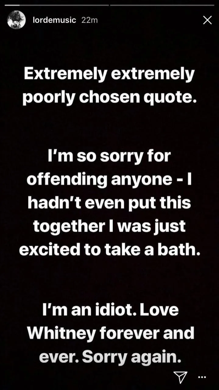 Her social media account soon became flooded with angry responses. Fans were “disgusted” and demanded that she remove the post. An hour later, the aforementioned post was deleted followed by an apology on her Instagram story. “Extremely extremely poorly chosen quote. I’m so sorry for offending anyone — I hadn’t even put this together, I was just excited to take a bath. I’m an idiot. Love Whitney forever and ever. Sorry again,” Lorde wrote.