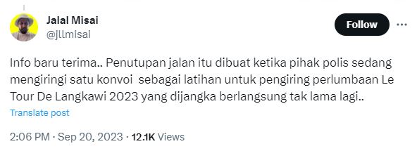 It was initially believed that the convoy had been a ministry convoy headed towards Putrajaya from IOI. However, it was later revealed that it had not been a ministry convoy, but instead, was a police convoy, reportedly out for an escort training exercise for the upcoming Le Tour De Langkawi 2023.