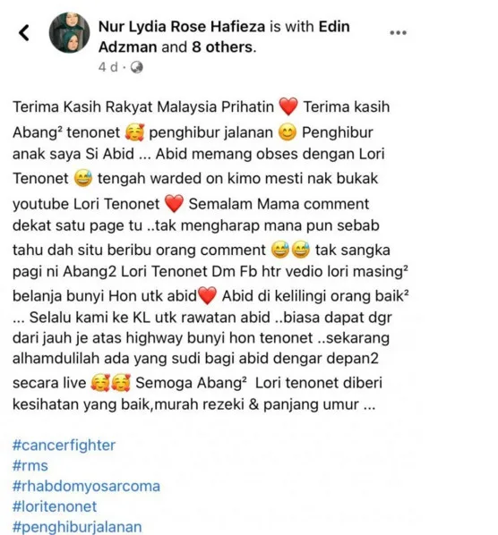 Recently, the story of a cancer-stricken boy named Abid caught local netizen’s attention. This came after his mom Nur Lydia Rose Hafieza took to her Facebook to share about her little son, who has a keen interest in listening to vehicles with “tenonet” horn sounds.