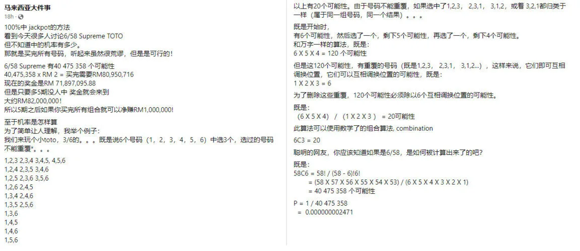Someone decided to calculate how one can win the Supreme Toto 6/58 jackpot which, at the time of writing, is worth RM71,897,095.88. The person wanted to determine how much would be needed to have a shot at winning the jackpot and if it was worth it.