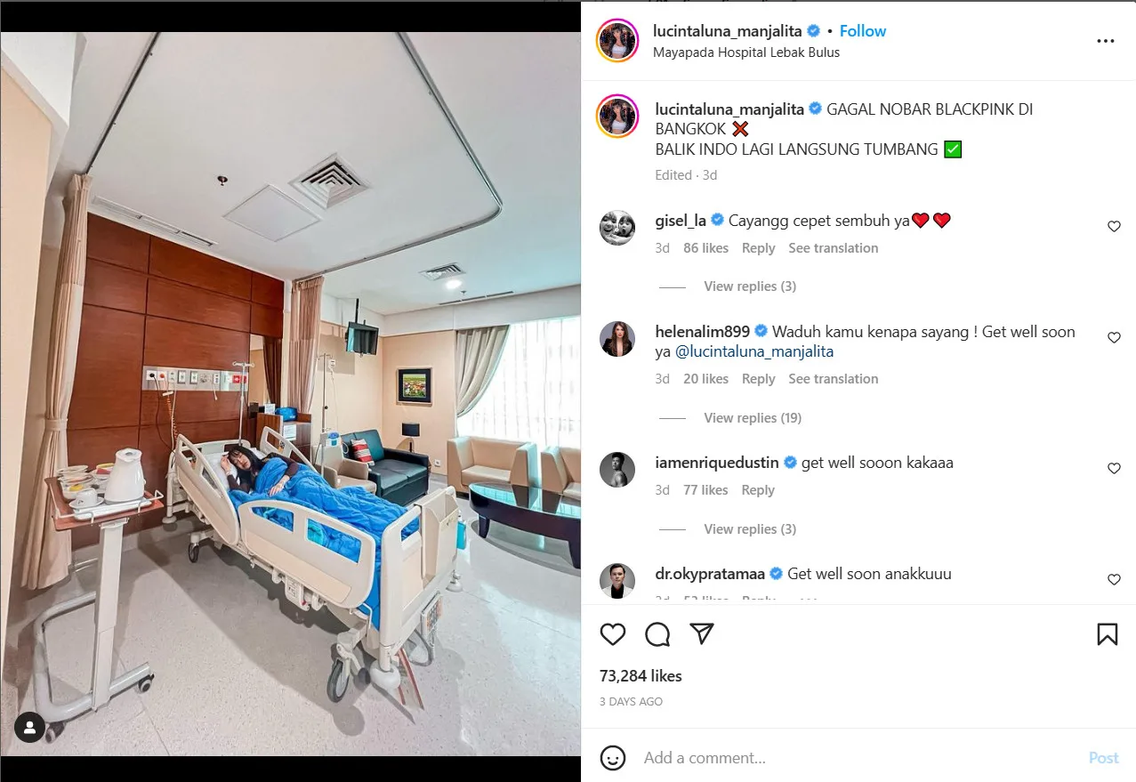 The Indonesian trans celeb took to her Instagram to share a pic of her lying on a hospital bed. She also lamented about not being able to attend BLACKPINK’s concert tour in Bangkok due to her illness.