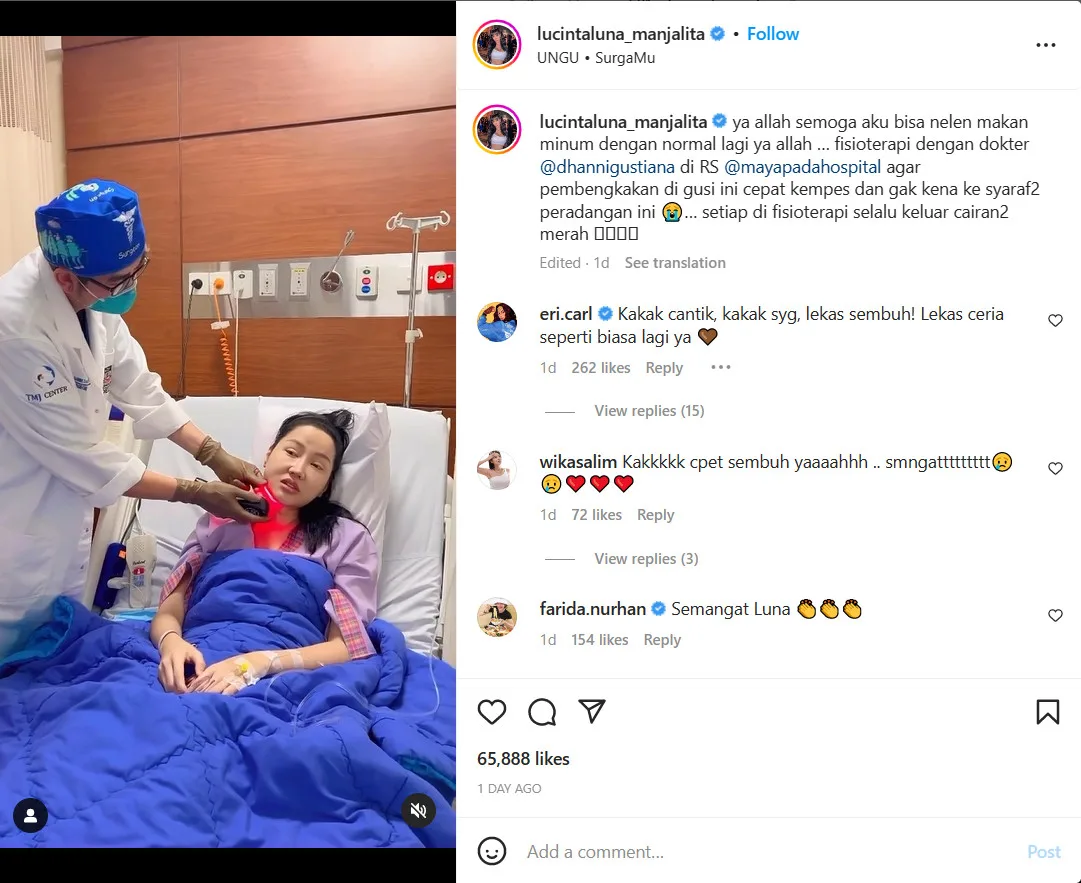 In a subsequent post, Lucinta uploaded a video of her undergoing physiotherapy session with the doctor. “Dear God, hopefully I can eat and drink normally again. Currently undergoing physiotherapy with @dhannigustiana from the @mayapadahospital so that the swelling in the gums quickly flattens and does not get to my inflamed nerves 😭. Every time I do the treatment, there will be red liquid coming out,” she revealed in her post.