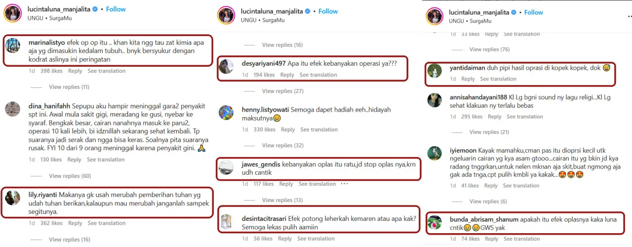 As a result, the comments section on Lucinta’s post was flooded with netizens giving their two cents. To quote one commenter on Instagram, “That might be the side effects of your surgical procedure. We’re not entirely sure what chemical substance was put into your body. This is a reminder for us to be more grateful.” Another netizen added, “Don’t change God’s creation that He had gifted you. Even if you want to alter your appearance, please don’t resort to that (surgery).”