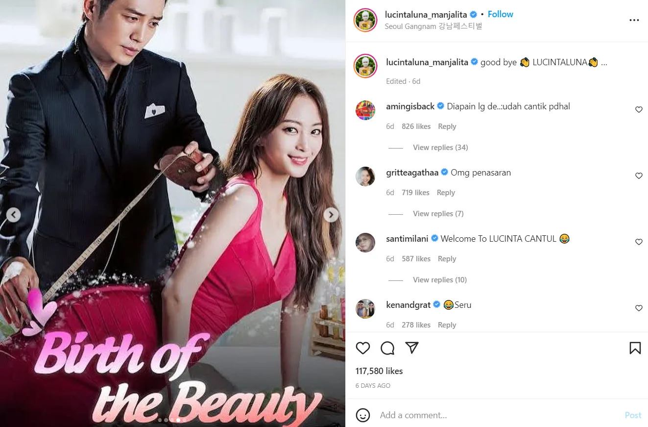 Previously, the “Cowok Baru” singer was also asked which celeb she would look like after the surgery on her Instagram Story. She responded by uploading a video featuring the “Lalisa” hit-maker. She even referred to herself as “Lucinta Blackpanther“. In addition, Lucinta also uploaded a poster of the K-drama “Birth Of A Beauty”, which stars Han Ye Seul. In the series, the main character (played by the aforementioned actress) undergoes plastic surgery and transforms herself into a more beautiful person.