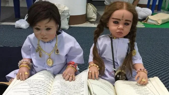 The strange phenomenon involves people “adopting” realistic-looking dolls for up to hundreds of dollars and getting them blessed with holy prayers by monks or holy men. But it’s not easy to achieve “success” – the doll must be kept happy for good luck and wealth will follow. Hence many “luk thep” owners care for the dolls as if they were real children.