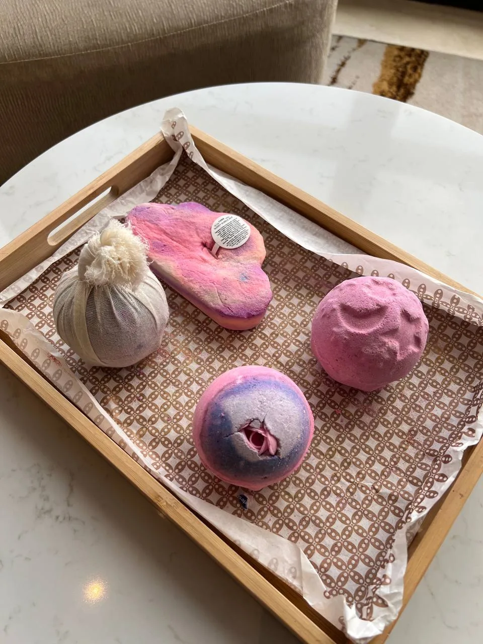 The Deep Dream Bath Bomb is wrapped with Lavender and Roman chamomile flowers in biodegradable muslin. When come in contact with warm water, it creates a hypnotic blend that smells like a calming cup of Chamomile tea.