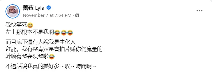 “I’m dying of laughter,” Lyla later confided to her fans on her personal Facebook. The artist reiterated that one of the photos didn’t belong to her before adding, “And there are people in the comments who say I’m a (modified person).”