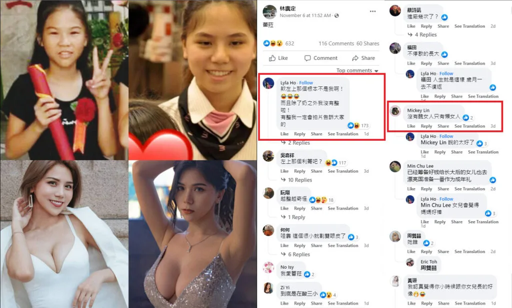 Needless to say, the timeline of photos left many stunned with several mocking her. Some questioned the number of times she had gotten surgery done while others called her a “生化人 (modified person)”. One comment even nastily read: “There are no ugly women, only lazy ones.”