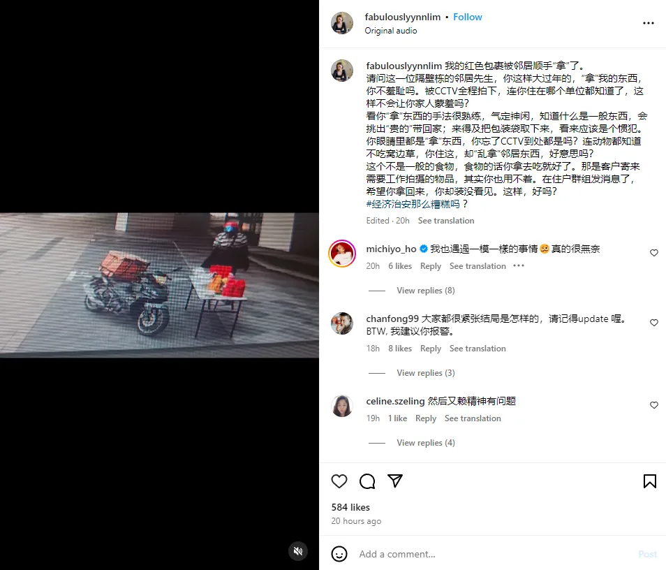 “I would like to ask this neighbour (from) the next building, are you not ashamed to take my things during Chinese New Year?” Lyynn asked in her post. “The entire process was captured on CCTV, and even the unit you live in is known. Wouldn’t this bring shame to your family?” The actress pointed out that the man was likely a repeat offender as he seemed calm and composed, and took the time to select the most “expensive” package.