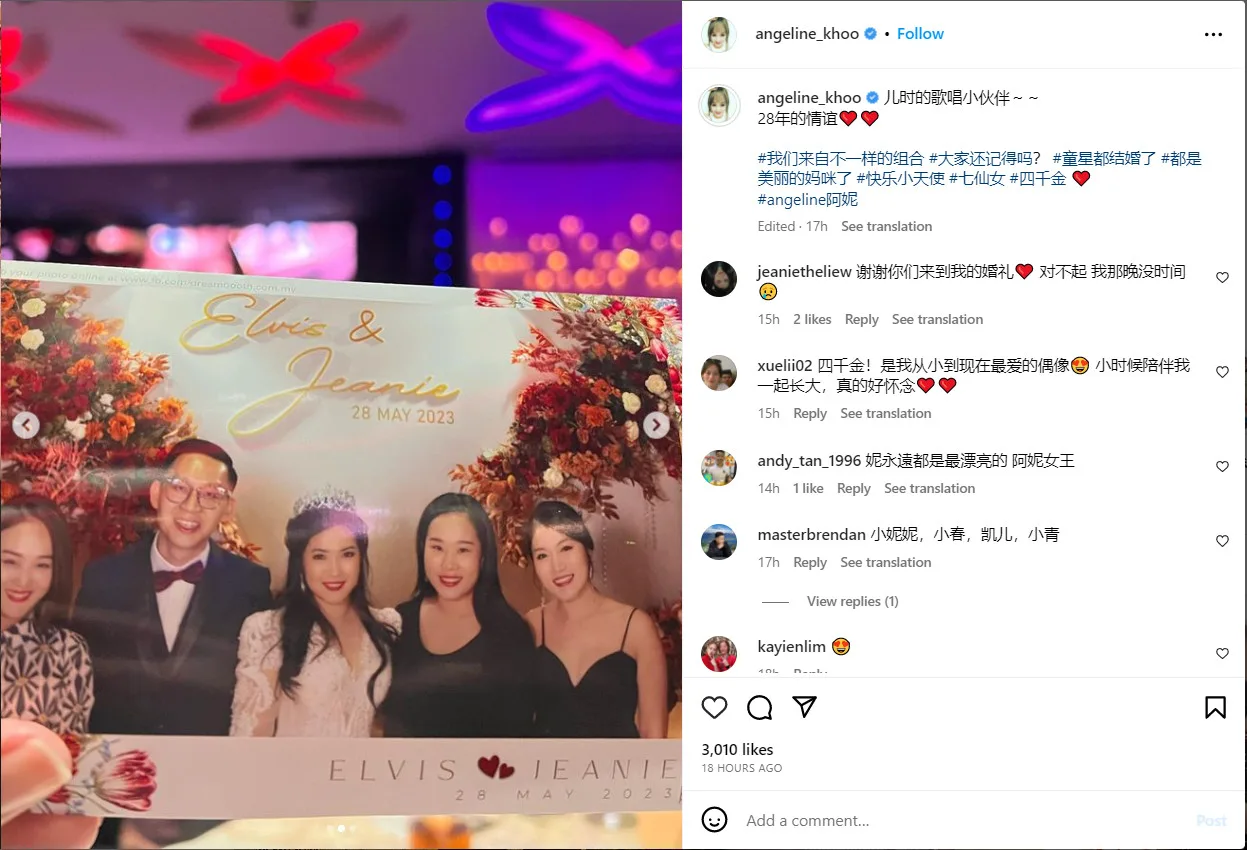 “My childhood singing partners,” Angeline captioned the adorable photo. “28 years of friendship.” From the photos, Angeline could be seen commemorating Jeanie’s special moment with Four Golden Princess (四千金) member Samantha Ee Kai Chee (凯儿) and the bride herself.