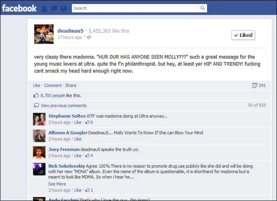“Molly” is also a slang for the active chemical in ecstasy, a drug often associated with EDM. That question alone blew up the entire internet. Blogs, twitter, and music critics alike. Including none other than Canadian EDM performer who was also at the Ultra Music Festival, Joel Zimmerman aka deadmau5.