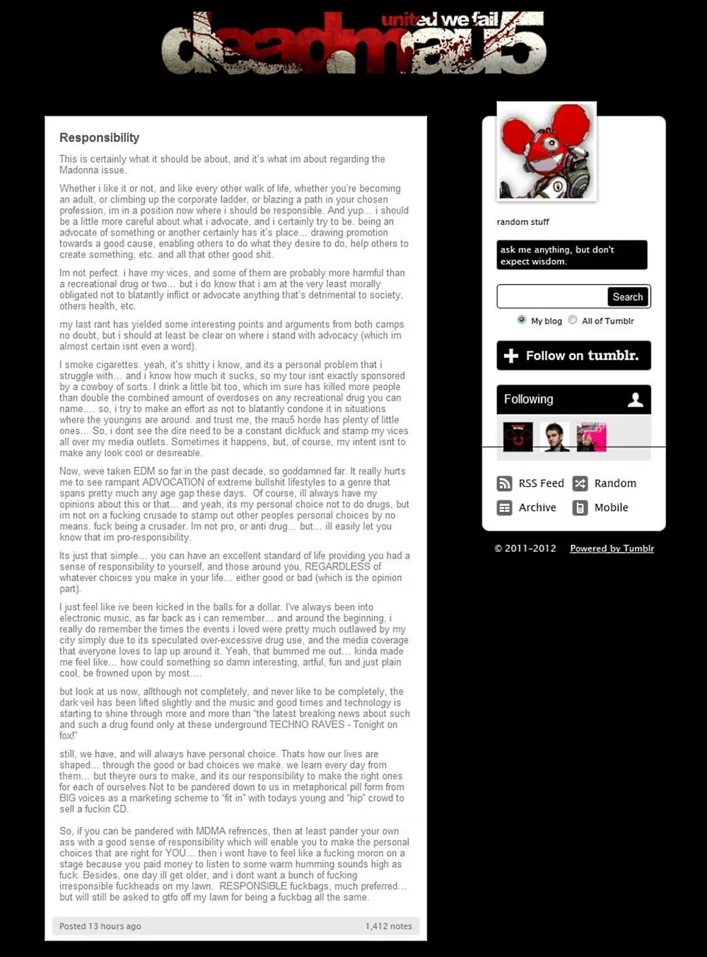 deadmau5, perturbed and insulted, did not at all mince his words and took the slamming to both his Facebook page, Tumblr, and Twitter account after Madonna’s cameo.