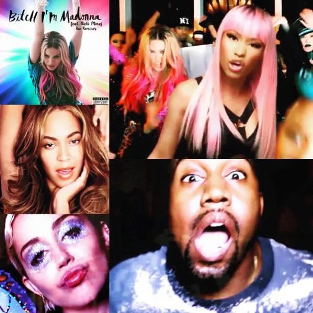 Throughout the clip, flashes of stars including Diplo, Beyoncé, Nicki Minaj, Katy Perry, Rita Ora, Miley Cyrus, Madonna’s son Rocco, Alexander Wang and Kanye West are seen mouthing the words “B*tch I’m Madonna”.