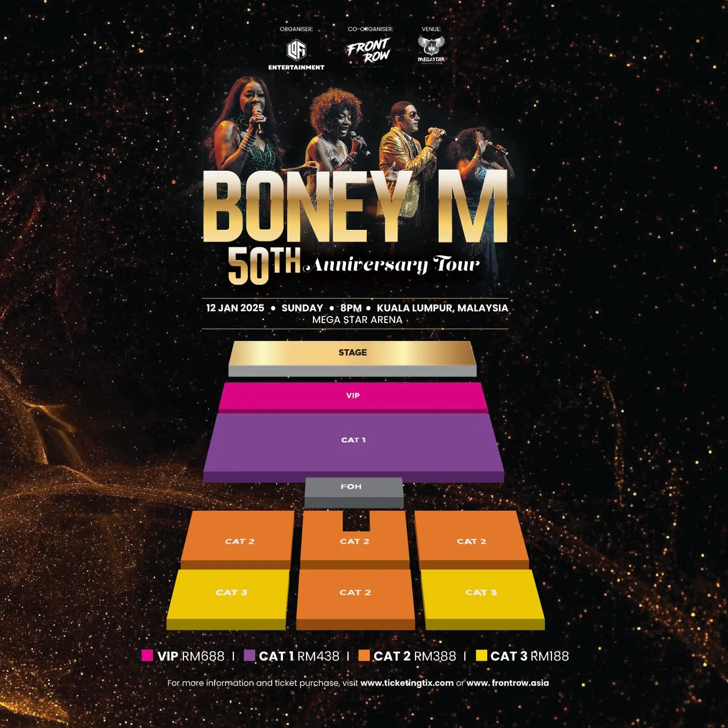 Organised by Lo-Fi Entertainment, with Front Row Entertainment as Co-Organizer, Boney M’s 50th Anniversary Tour in Kuala Lumpur – led by original member Maizie Williams – will light up Mega Star Arena, KL on 12th January 2025.