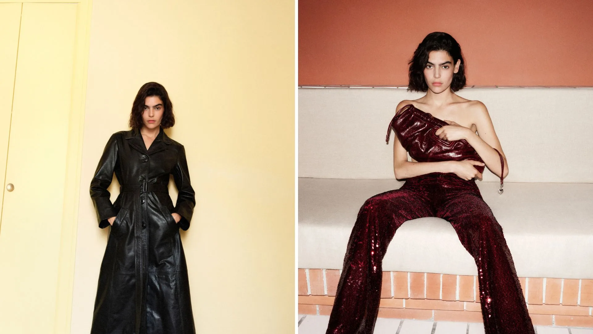 Wrapped in an oversized vinyl jacket, she stands out by pairing it with a bold coral knit brief. Daring, in a sheer lace dress that reveals just enough. Sensual, in a deep burgundy suit worn directly on bare skin. She isn’t looking for anything, and that’s precisely why all eyes are on her. Every gesture, every move, is noticed, even when she’s unaware.