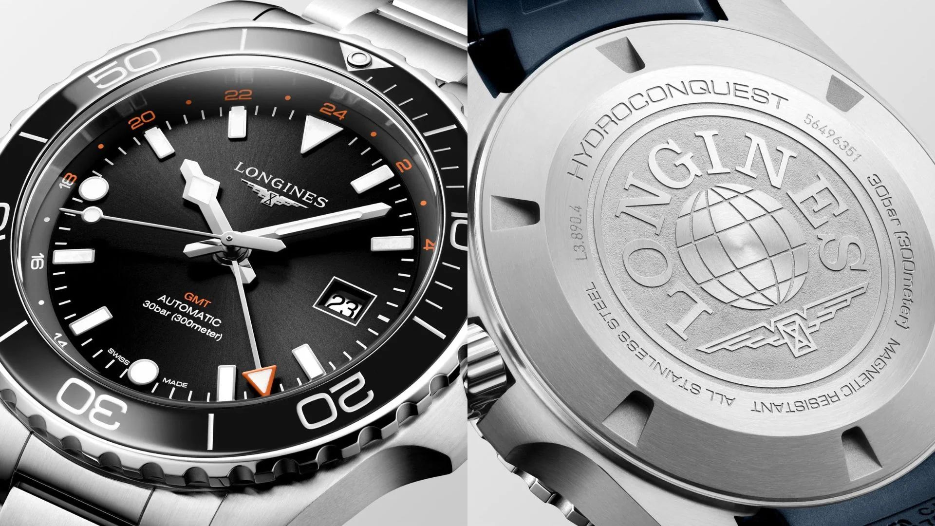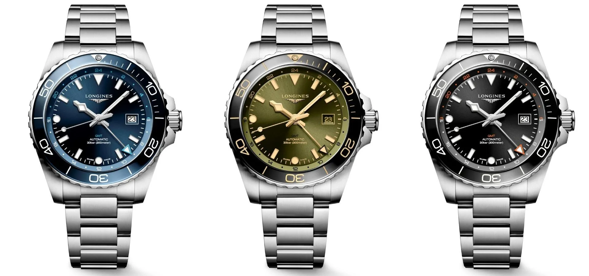 The new HydroConquest GMTs come in black, blue, or green dials and have a sapphire crystal with a multi-layer antireflective coating.