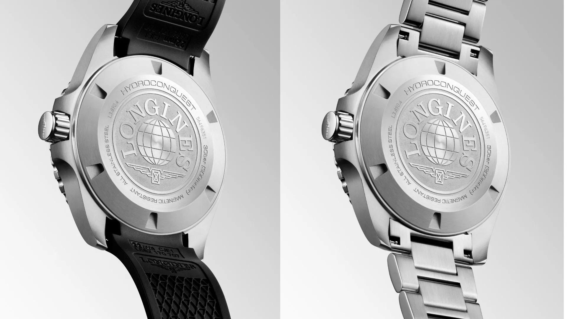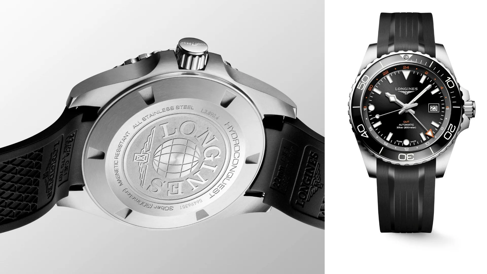 Alternating polished and satin-brushed faces, this new generation still has all the features that made the HydroConquest GMT so iconic, such as being water-resistant up to 30 bar (300 metres), robust, and with a unidirectional rotating ceramic bezel, screw-in crown, and screw-down case back.