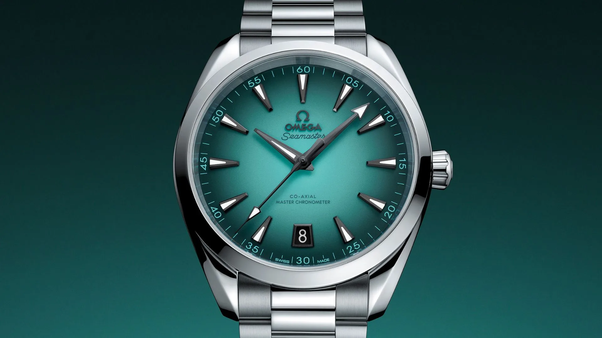 This 41 mm watch is crafted in stainless steel and is notable for its lacquered turquoise dial with a black gradient effect. It’s a vivid colour choice, inspired by the ocean, that aligns with the Aqua Terra’s iconic marine heritage.