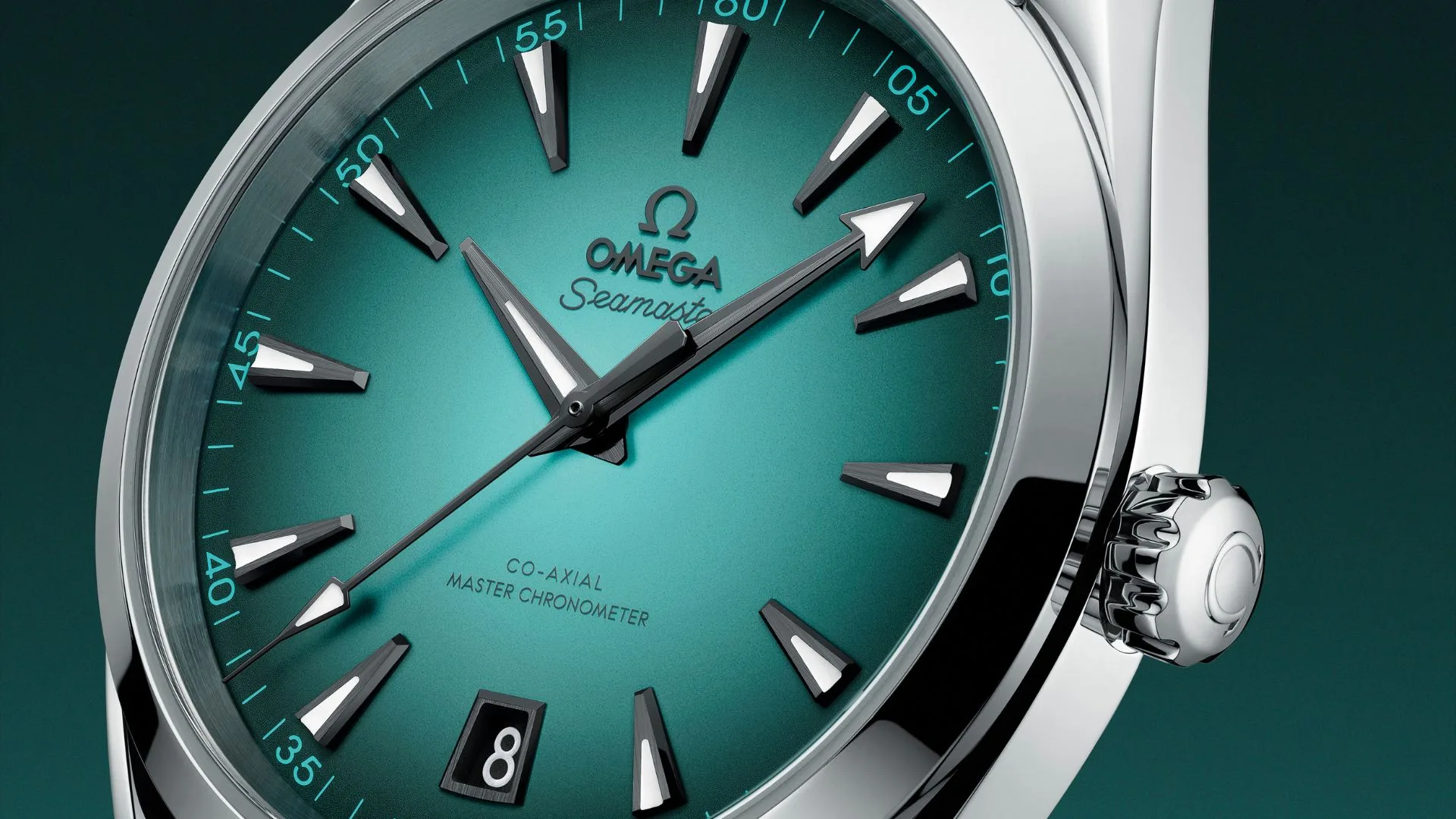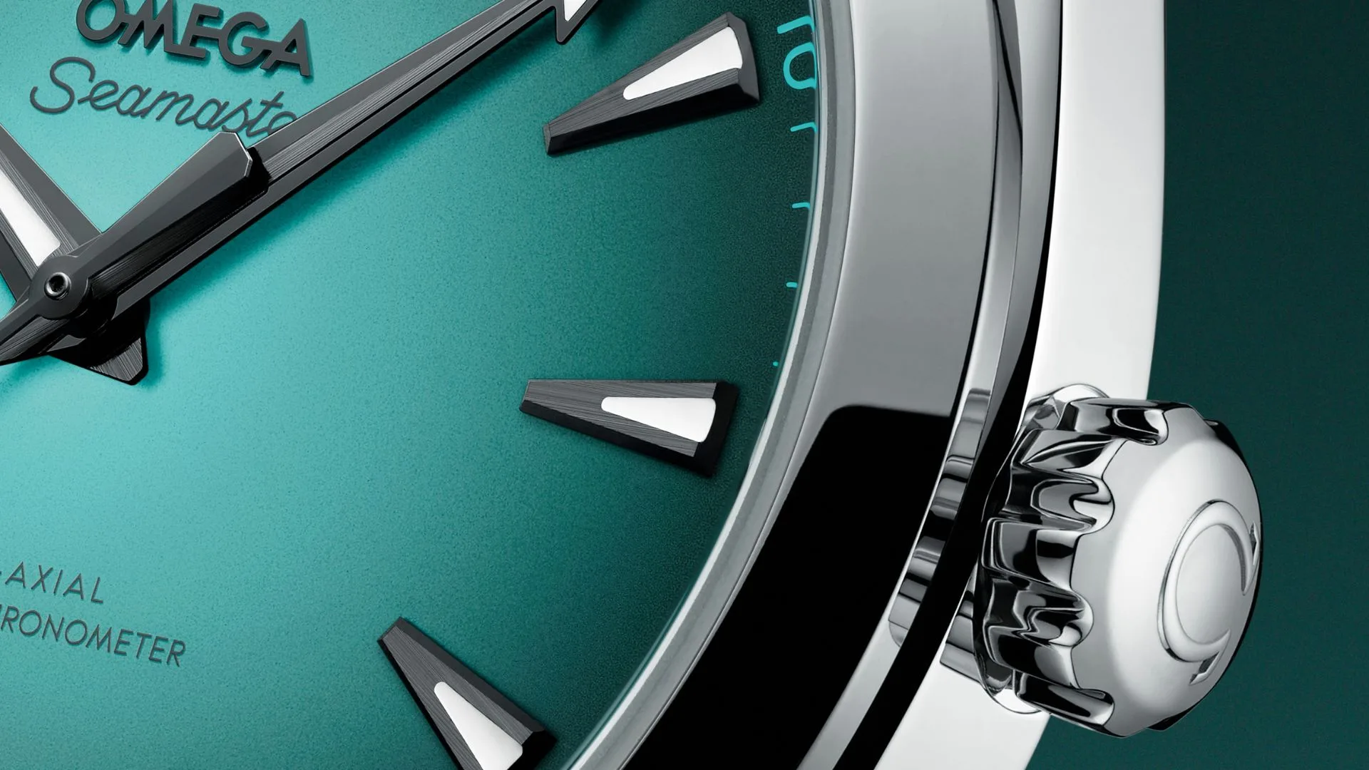 The hands, hour markers, date window, and OMEGA logo are all grey PVD treated, while the seconds track around the outside of the dial is transferred in turquoise.
